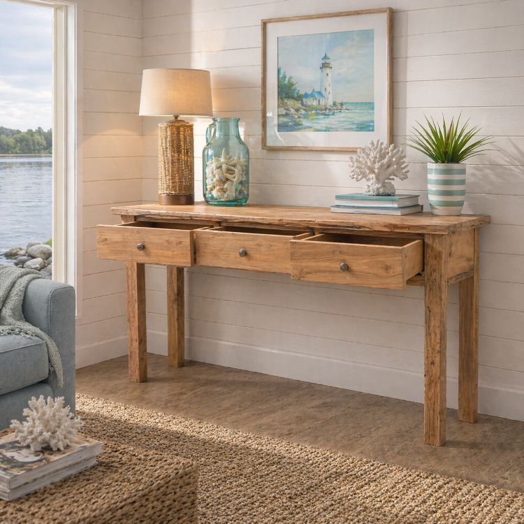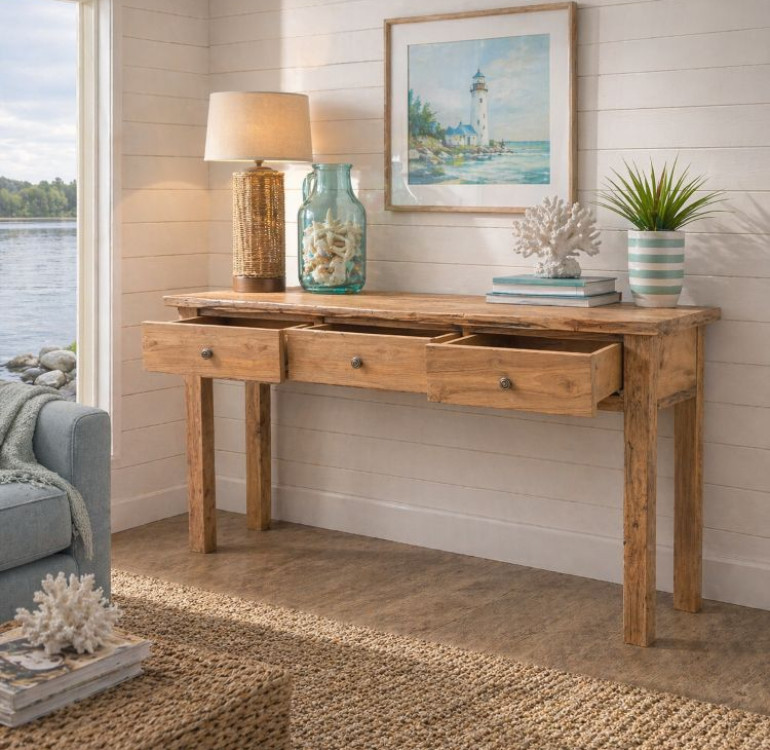 Add effortless style and practical storage to your home with this beautifully handcrafted teak console table. Made from solid teak, each piece highlights the natural character of the wood, with a warm rustic finish that enhances its unique grain and organic texture.