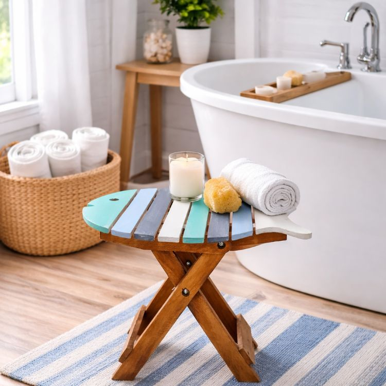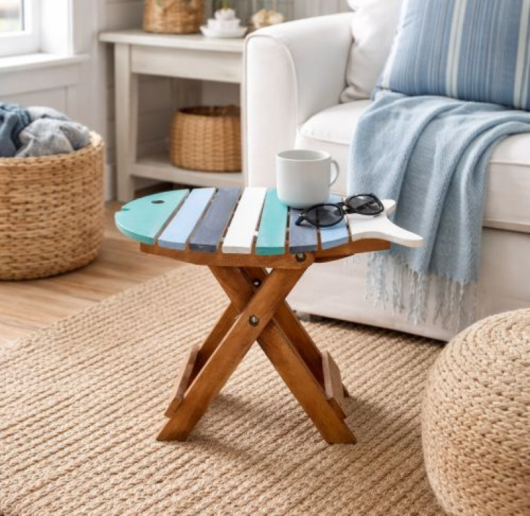 Foldable side tables with a fish top, hand painted in coastal colours of blues, turquoise and white. Natural wood legs.