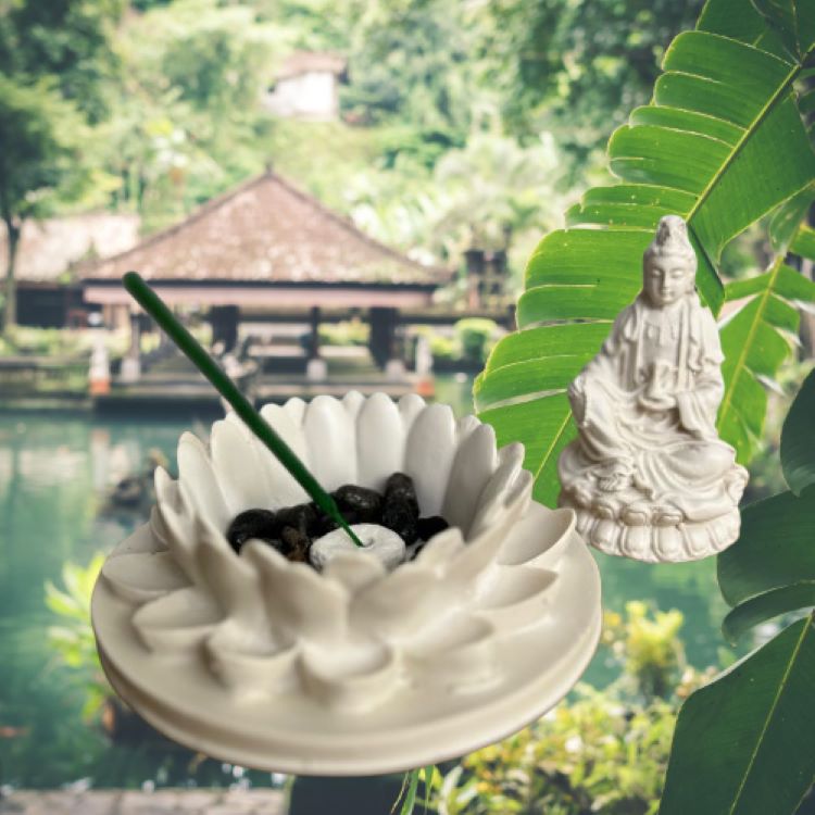 White stone effect buddha sat on stones (to replicate a garden) in a lotus flower as the main centrepiece. Pack of Sandalwood incense sticks.