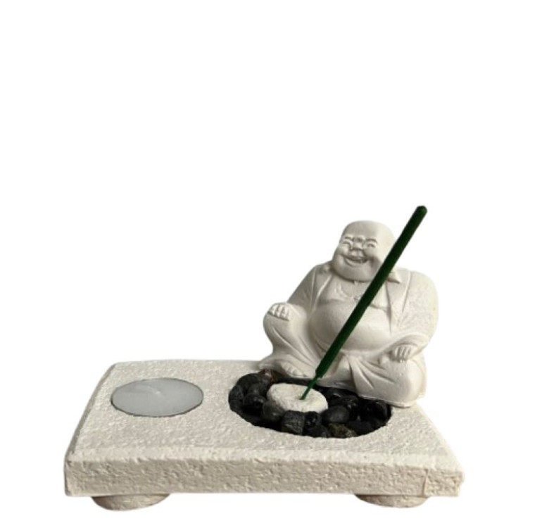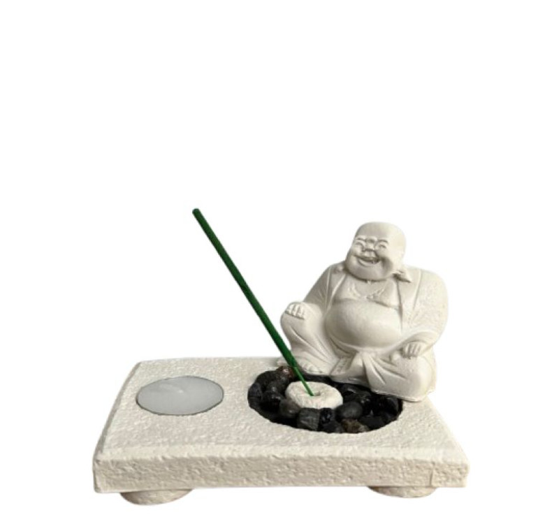 White stone effect a sitting laughing buddha sat on stones (to replicate a garden) as the main centrepiece. T-light included and a pack of Sandalwood incense sticks.