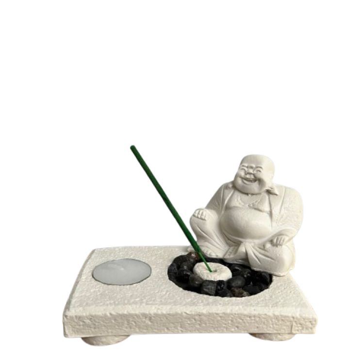 White stone effect a sitting laughing buddha sat on stones (to replicate a garden) as the main centrepiece. T-light included and a pack of Sandalwood incense sticks.