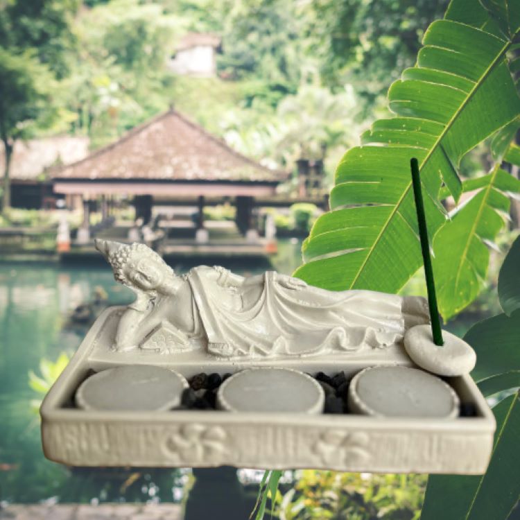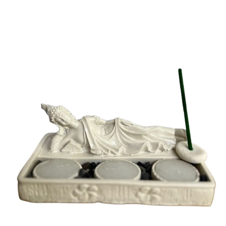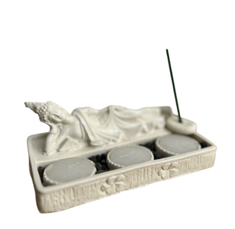 White stone effect a lying down buddha as the main centrepiece with 3 T-light holders and an incense. T-light included and a pack of Sandalwood incense sticks.