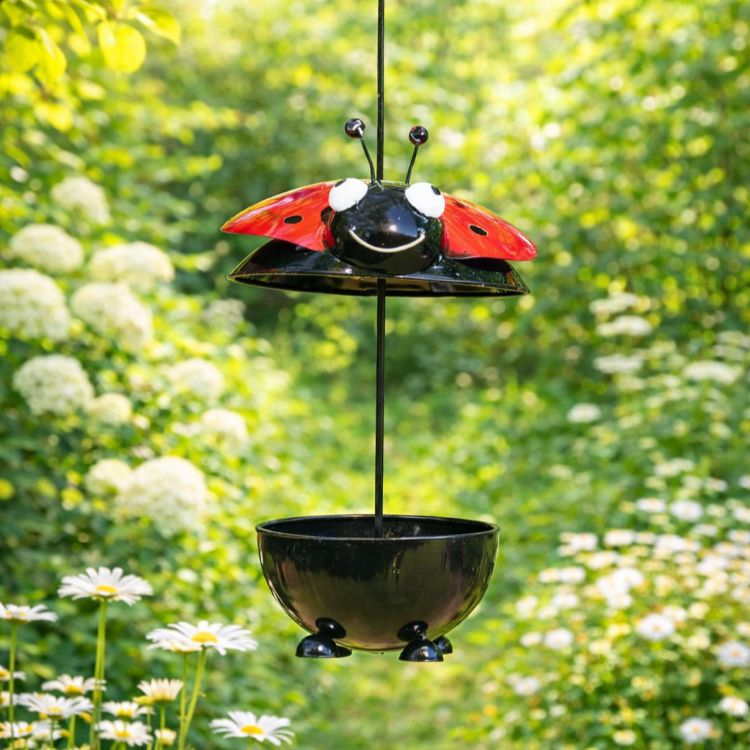 Bring charm and character to your garden with our handmade metal ladybird top hanging bird feeder. Beautifully crafted with a vibrant red ladybird canopy, this feeder not only attracts birds but adds a delightful decorative touch to any outdoor space.