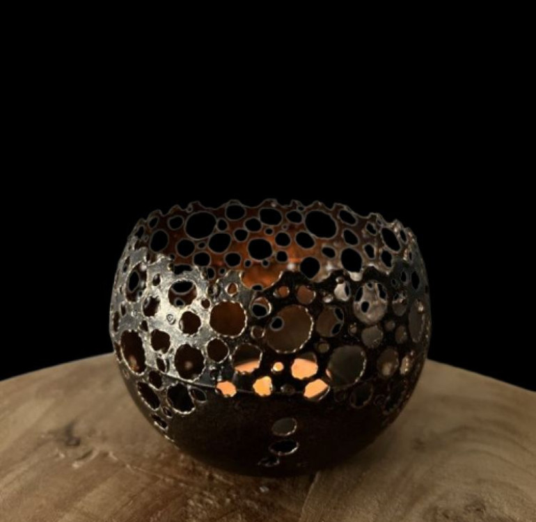 Shaped into a sphere with a T-Light holder in the inner base, when T-light lit it reflects a wonderful decorative light on the wall and surroundings.