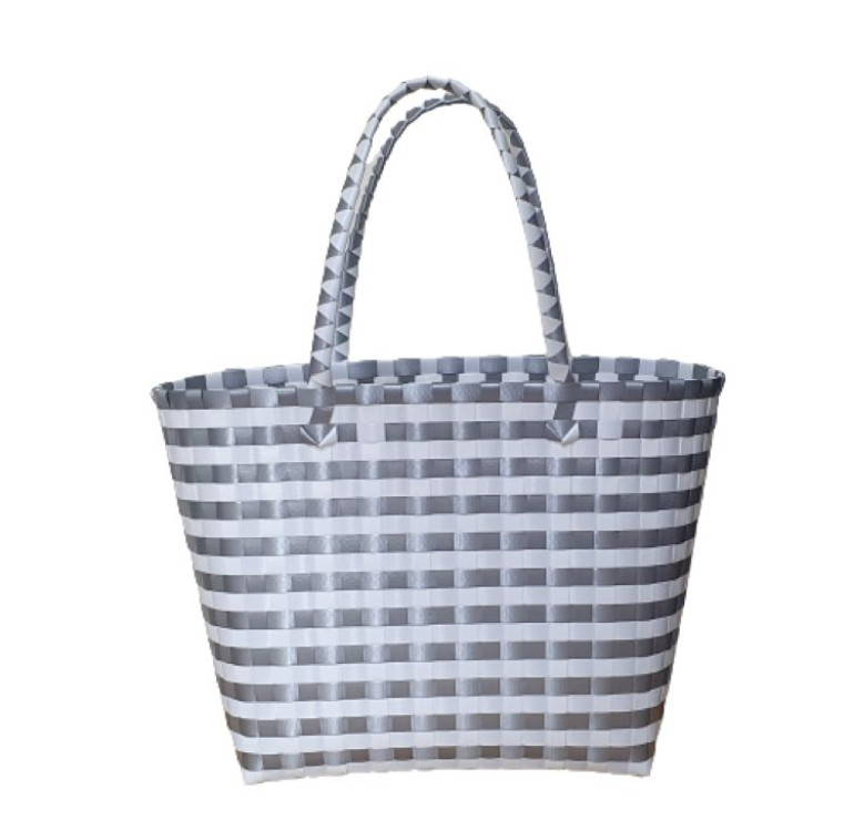 Recycled Plastic Hand Woven Small Silver and White Check Bag