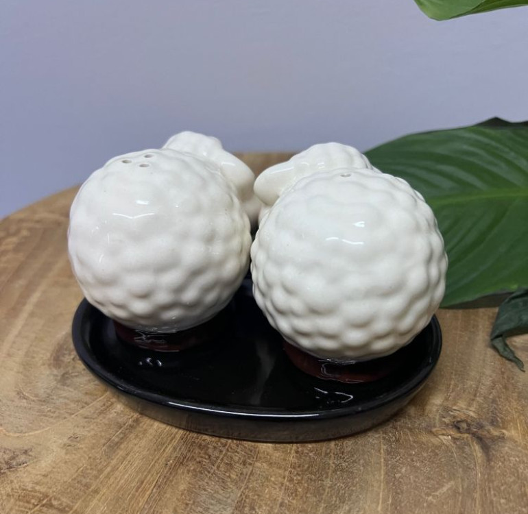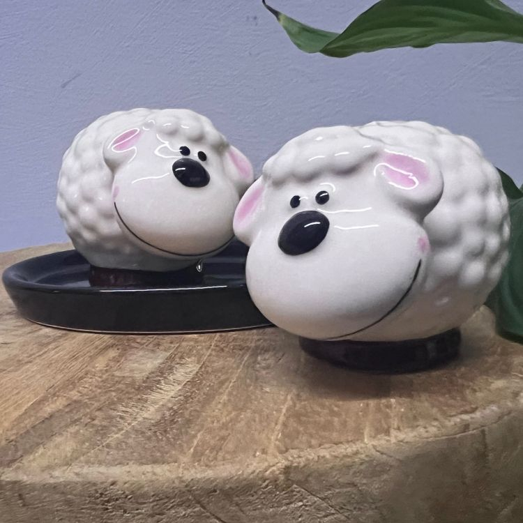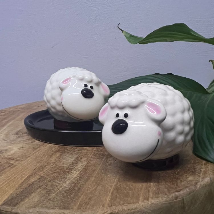 Black and White Furry Sheep Salt and Pepper Shakers on a ceramic base.