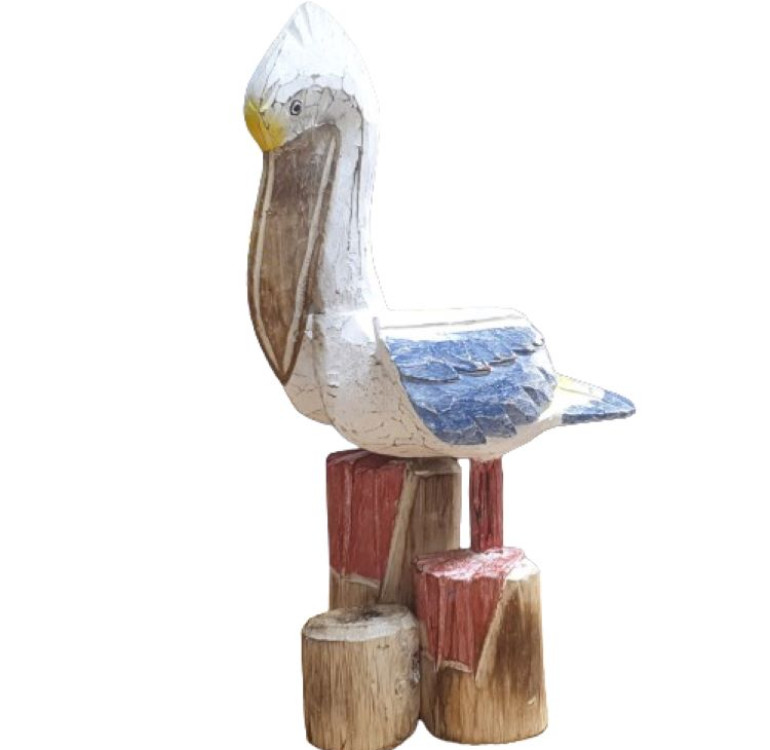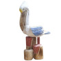 Hand Carved Blue Wing Wooden Pelican on Pilings Ornament, Sculpture, Statue