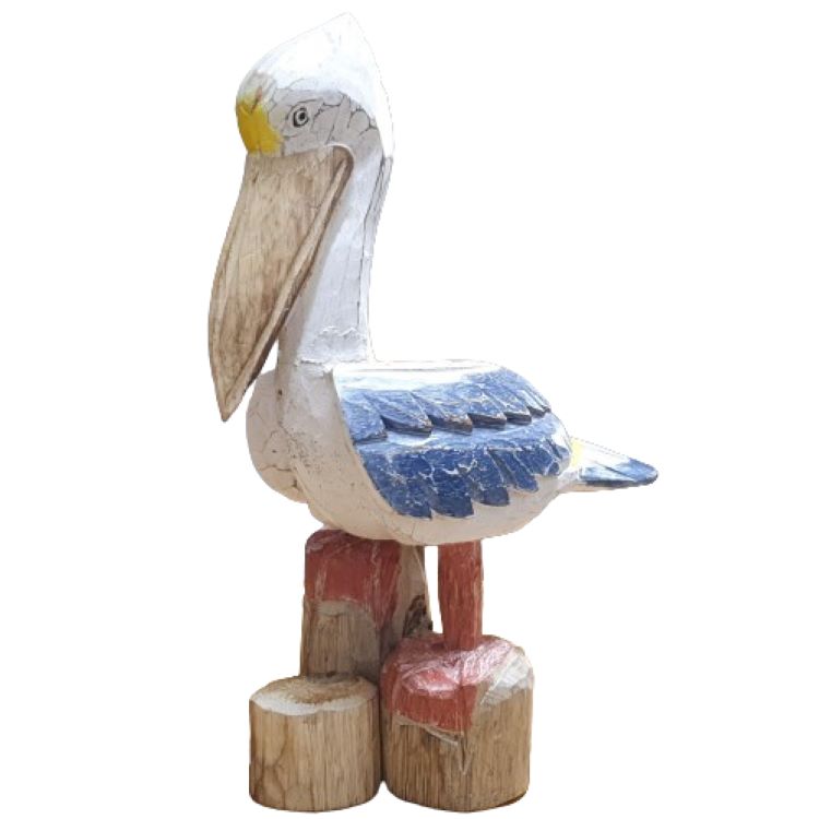 Hand Carved Blue Wing Wooden Pelican on Pilings Ornament, Sculpture, Statue